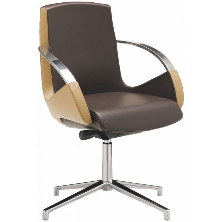 Poltrona interlocutore dalle forma innovative e confortevoli,telaio interno in acciaio da un 'imbottitura puliuretanica schiumata a freddo,piastra e pompa a gas per la regolazione dell'altezza,braccioli e base a 4 razze in alluminio pressofuso e spazzolato con piedini gommati.